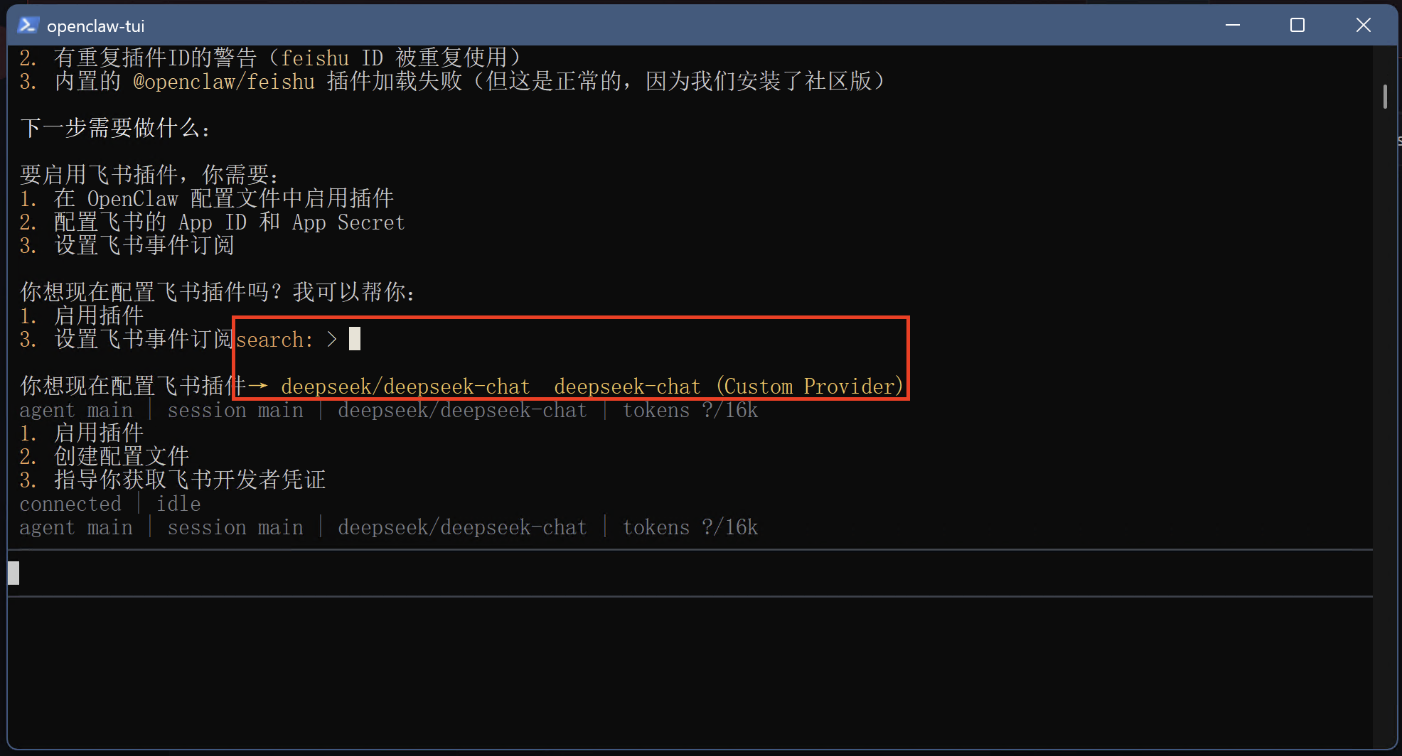 openclaw tui打开命令行交互界面。 - 在对话框中输入