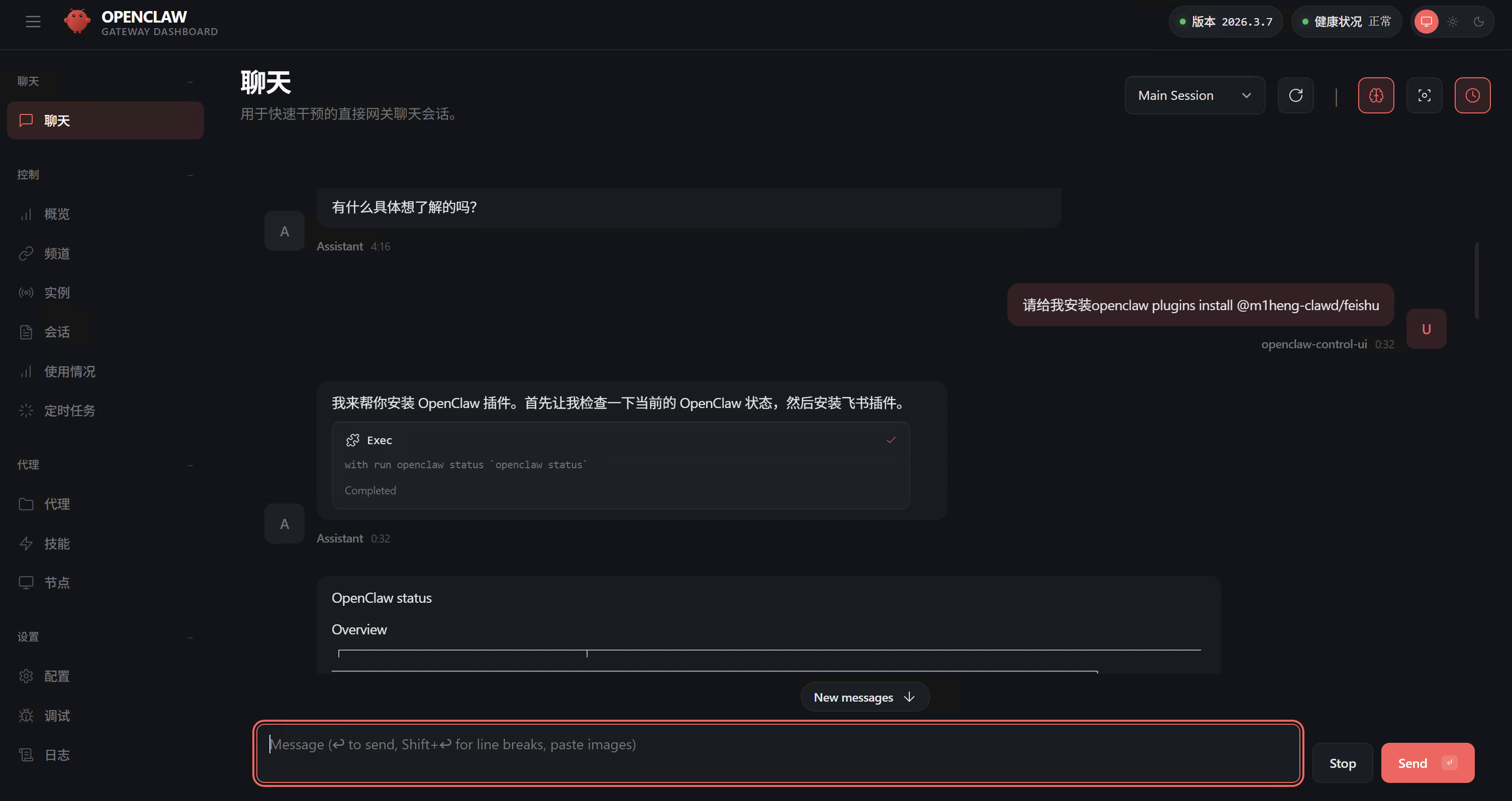 open in web ui,将启动网关服务并在浏览器弹出控制台页面http://127.0.0.1:18789/。控制台启动完成并可发消息回复,即代表基础运行成功。(注:目前 Web UI 界面仍处于早期阶段,体验还不是很完善。对于熟悉命令行的用户,强烈推荐使用命令行交互,后续可通过终端输入openclaw tui进入。)