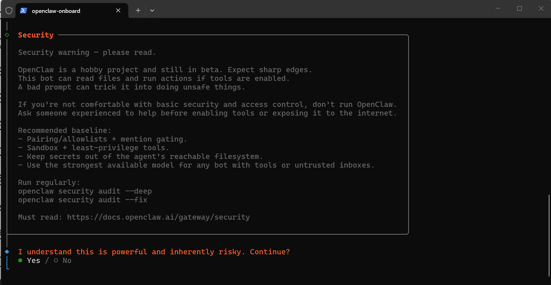 I understand this is powerful and inherently risky. Continue?,请选择Yes。
