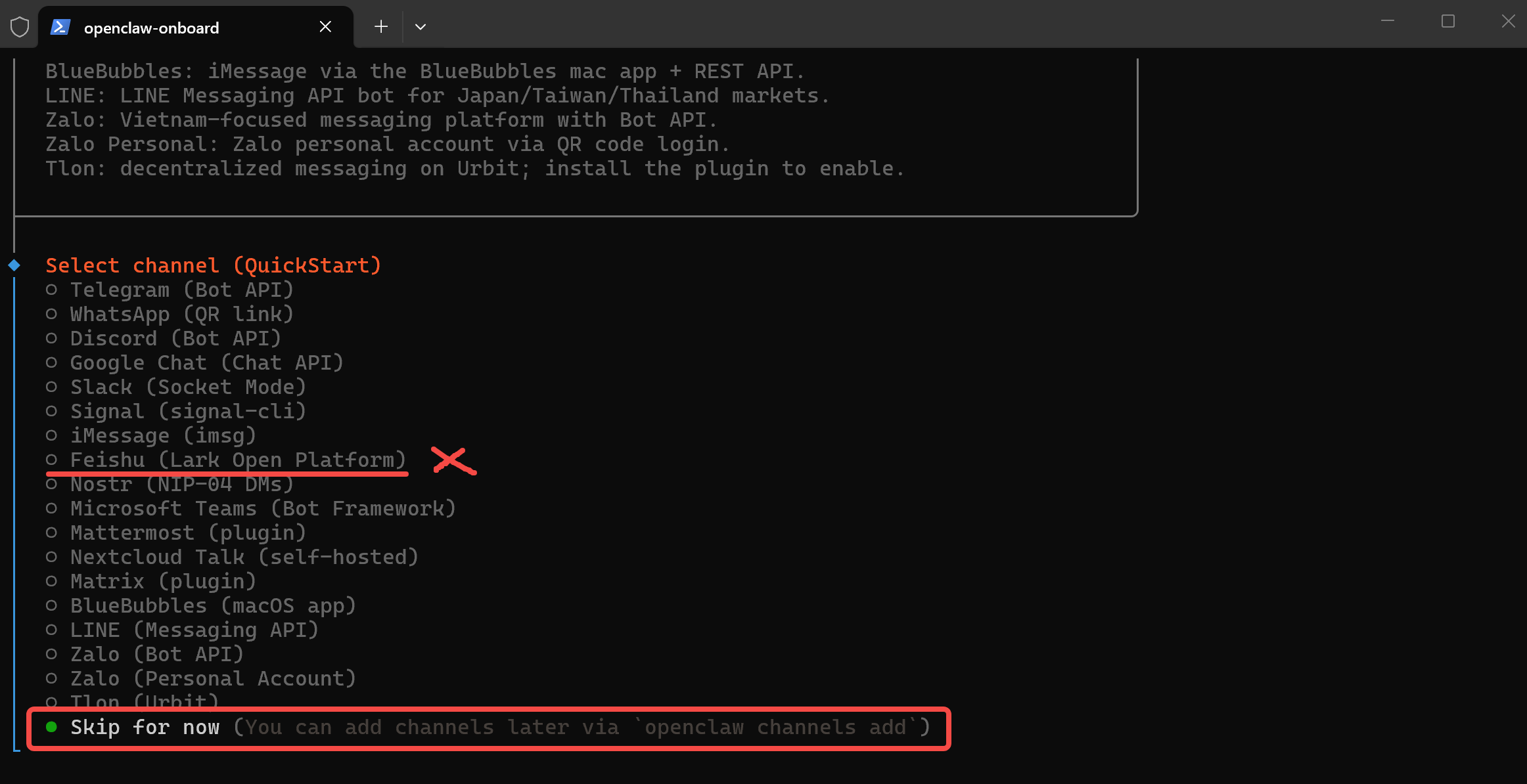 - Select Channel/Search Provider/Skills:官方建议 Windows 原生最好通过 WSL2 运行飞书等 IM 插件,因此在此步骤的连接频段建议先