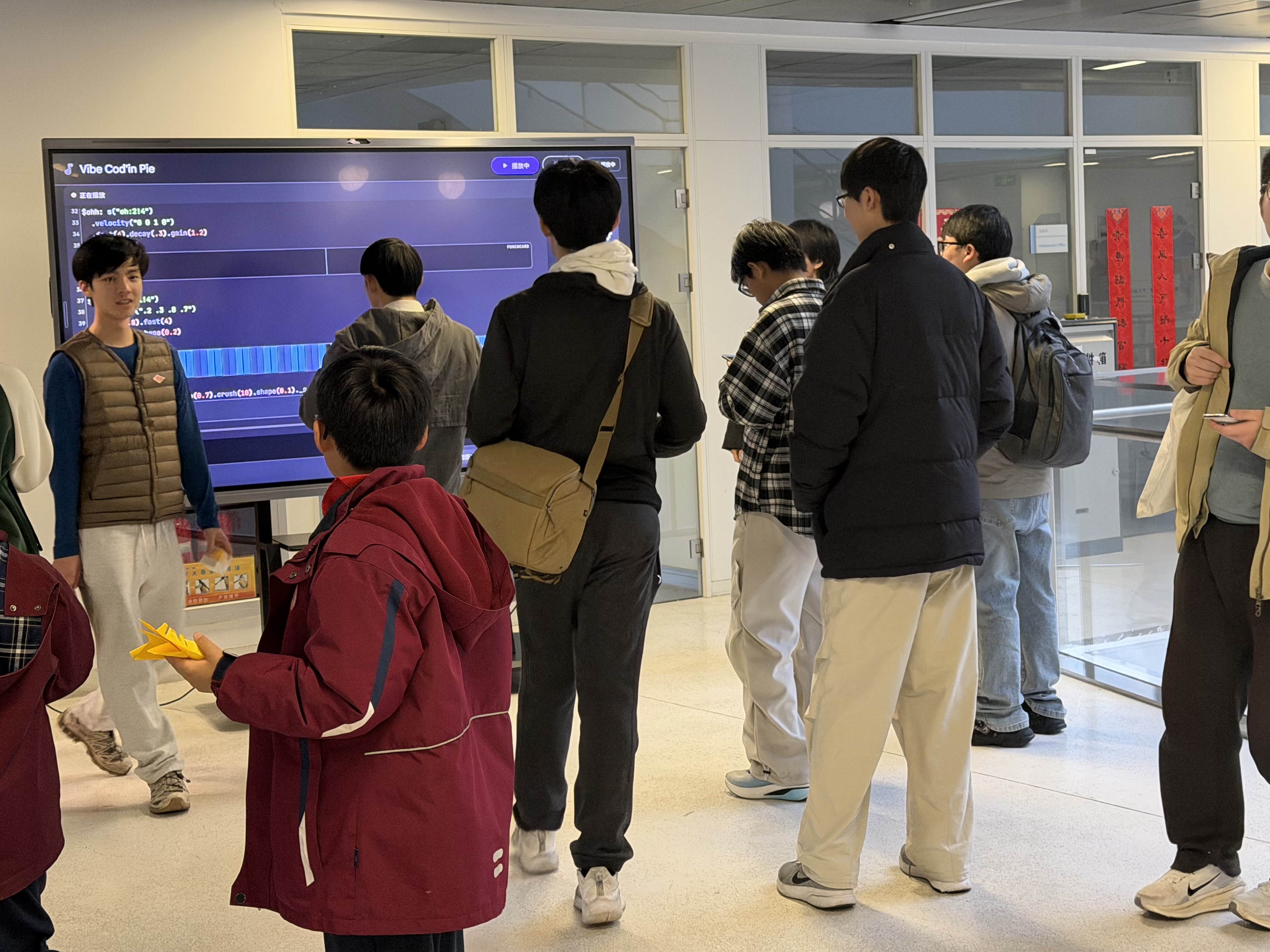 而全场最高人气的还要数 “Vibe Cod'in Pie” 区域了,大家可以现场当一回极客 DJ。只要扫码输入“让节奏快一点”或者“加一点赛博朋克感的贝斯”,这套实时电子乐系统就会在几秒钟内把自然语言转换成代码,并在大屏上播放出来。不少书院的老师也被这种新奇的玩法吸引,加入扫码发弹幕的队伍,和同学们一起跟着节拍感受 AI 编曲的乐趣。